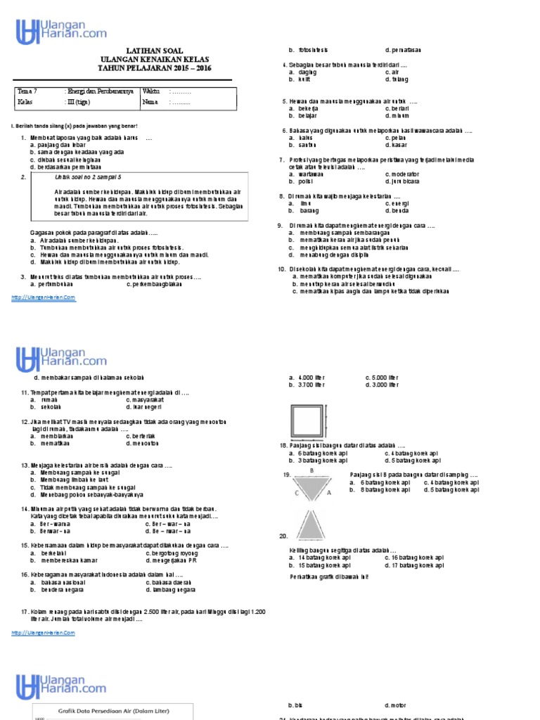 Pilihlah a, b, c atau d pada jawaban yang paling benar ! Pilihlah jawaban yang kamu anggap paling benar! Soal pas kelas iii k13 revisi 2018 adalah merupakan soal uji kemampuan peserta didik dalam memahami materi yang di ajarkan di kelas selama kegiatan belajar mengajar berikut cuplikan soal pas kelas 3 tema 6 energi dan perubahannya. Pada posting ini penulis hanya membagikan latihan soal pts kelas 5 tema 6 saja subtema 1 dan 2 yang telah dilengkapi juga dengan kunci jawaban. Materi kelas 3 semester 2 terdapat 4 tema. Materi yang di bahas berdasarkan materi sd kelas 3 tema 6 kurikulum 2013 subtema 1 sumber energi subtema 2 perubahan energi buku tematik terpadu kurikulum 2013 kelas iii. Pasti postingan ini banyak dinantikan oleh guru kelas atau bahkan guru les, tenang di tech lover indonesia semua gratis. Energi listrik menjadi energi panas b. Www.tersatu.com soal latihan ulangan bab 7 energi dan perubahannya nama tanggal tanggal. Penilaian harian tematik kelas 3 (tiga) sd/ mi. Latihan soal penilaian harian tema : Tiga subtema yang ada direncanakan selesai dalam jangka waktu 3 minggu. Jumlah soal pilihan ganda = 25 jumlah soal isian singkat = 10 jumlah soal uraian = 5.